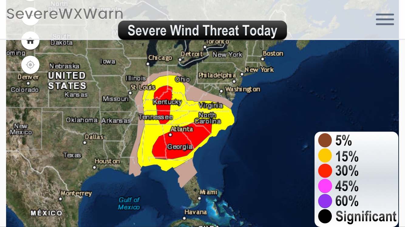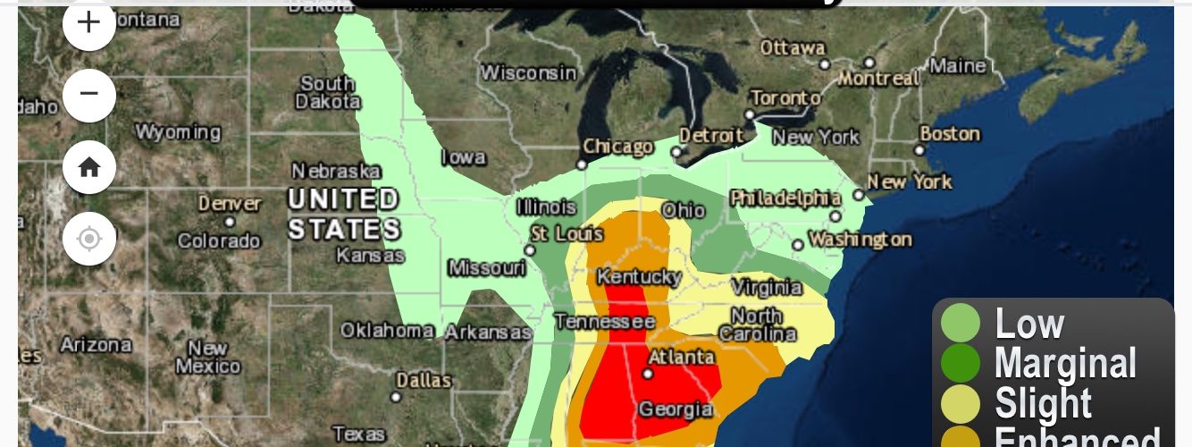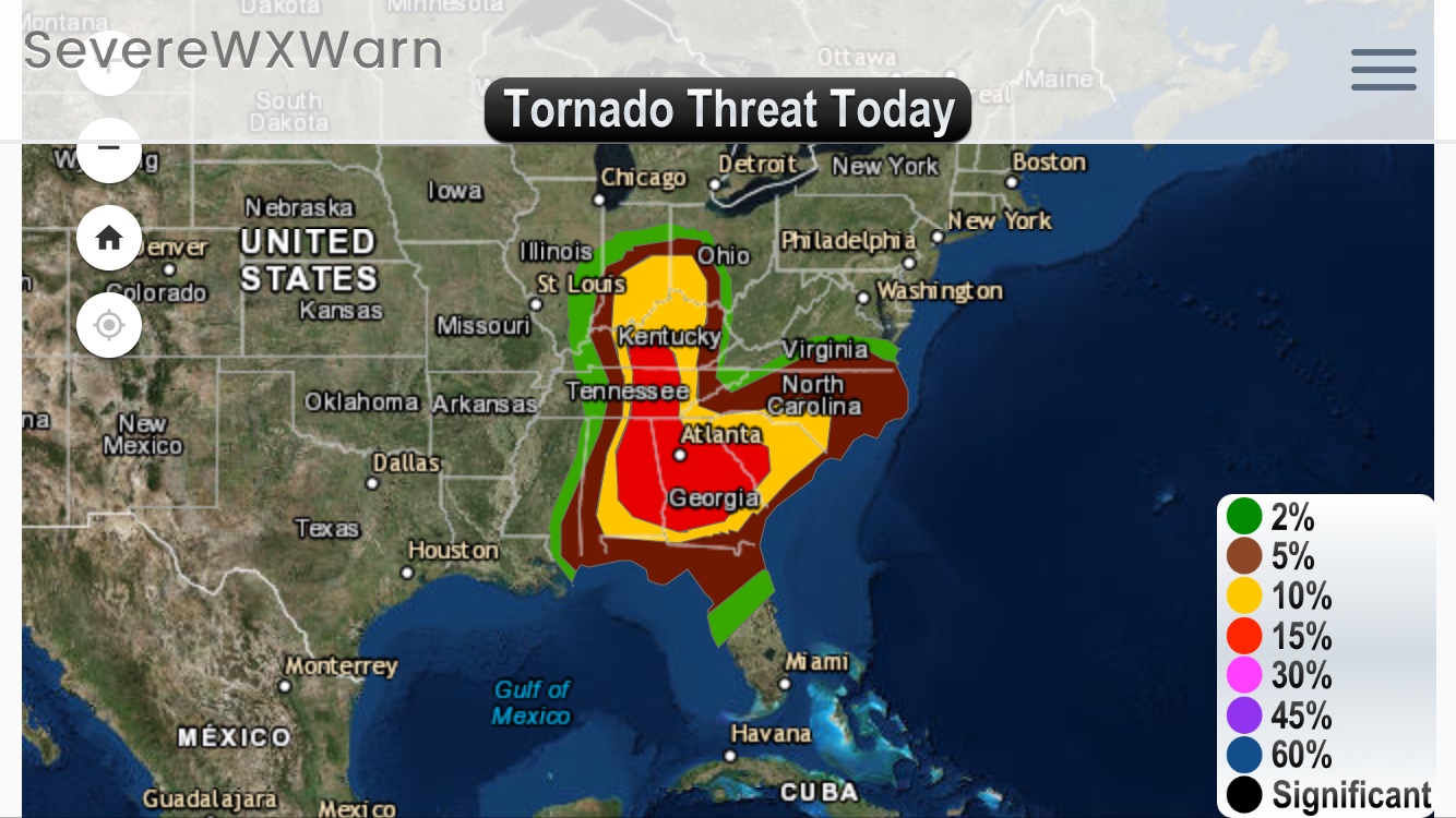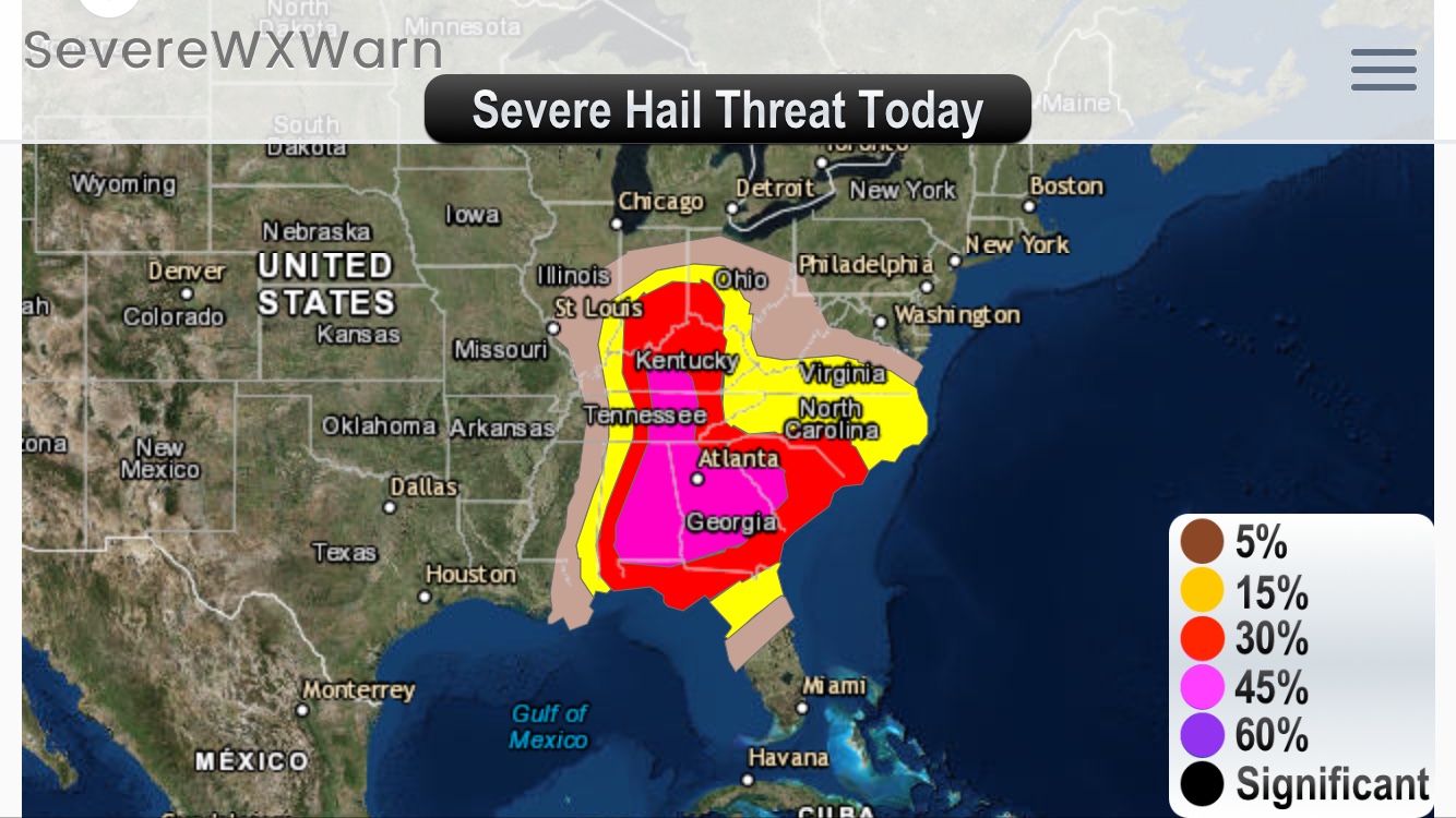 An outbreak of severe weather is likely today and with that it will bring a chance for a few strong tornadoes, large hail and some damaging winds. There is currently a moderate risk for severe thunderstorms today for Eastern Alabama and across Georgia and parts of western South Carolina onward through Eastern Tennessee and Southern and Central Kentucky. There is an enhanced risk for severe weather from the Ohio Valley into the Carolina’s and along the Northeast Gulf Coast. The surrounding areas will also have a risk for severe weather throughout the afternoon and night, though the chances will be lower. Storms can be expected to form in Missouri this evening as well as in Ohio moving into the Southern Appalachians overnight. The storms should progress through middle Tennessee and Central Alabama by late evening. The storms will then progress into Georgia and the Carolina’s overnight bringing a chance for pretty decent supercell development. The largest threat for storng tornadoes this afternoon/evening will be across Eastern Alabama, Georgia and West Central South Carolina. Overnight the storms will move eastward into across Georgia, South Carolina and North Carolina will some tornadoes, hail and severe winds being possible.