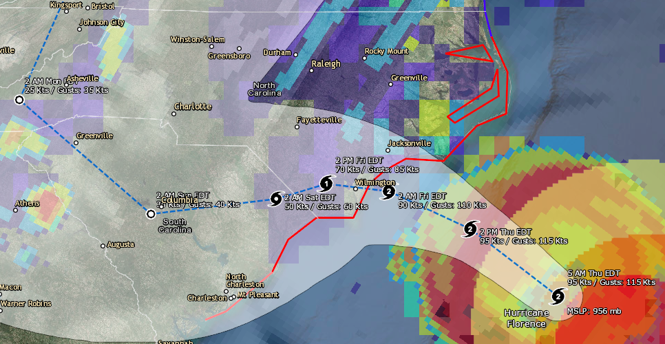 The satellite presentation of Florence has changed little overnight with the eye waxing and waning in infrared imagery. The eye has moved into NWS radar range and can be seen in radar data from Morehead City and Wilmington NWS 88-D imagery. An 0616 UTC AMSR2 microwave overpass indicated that the convection over the southern and southeastern portions of the storm is still disrupted, and that the eyewall was open to the southeast. An Air Force Hurricane Hunter aircraft also reported that the eyewall was not fully intact on its last pass through the storm just after that time. The Air Force plane measured a peak 700-mb flight level wind of 102 kt and peak SFMR winds of 85 kt during the mission. These data suggest that the intensity may be slightly lower, but the initial intensity has been maintained at 95 kt, since the plane may not have sampled the strongest winds. Another Air Force plane will be in Florence shortly, and should provide a better assessment of the intensity of the hurricane. As mentioned in the previous discussion, it appears that some southern shear has caused the degradation of the inner core. The global models suggest that this shear will relax today while Florence moves over warm waters, however, given the current storm structure, little overall change in strength is anticipated as Florence approaches the coast. Gradual weakening should occur as the hurricane interacts with land in 24-36 h, with a faster rate of weakening predicted once Florence moves farther inland. Florence is moving northwestward or 315 degrees at 13 kt. A developing mid-level ridge over the north-central United States should cause the forward speed of the hurricane to decrease today. As the steering currents collapse tonight and Friday, Florence is forecast to drift westward or west-southwestward and continue that slow motion into the weekend. The global models predict that the ridge will slide eastward over the weekend, which should allow Florence to turn northwestward and northward by the end of the forecast period. Although there is still some spread in the guidance by 48 hours, with the GFS along the northern side of the guidance envelope, and the ECWMF along the southern edge, the various consensus aids have moved little. As a result, the new NHC forecast track is very similar to the previous advisory. Aircraft and satellite wind data show that Florence is a large hurricane. Life-threatening storm surge, heavy rainfall, and damaging wind will cover a large area regardless of exactly where the center of Florence moves. Key Messages: 1. A life-threatening storm surge is now highly likely along portions of the coastlines of South Carolina and North Carolina, and a Storm Surge Warning is in effect for a portion of this area. All interests in these areas should complete preparations and follow any advice given by local officials. 2. Life-threatening, catastrophic flash flooding and prolonged significant river flooding are likely over portions of the Carolinas and the southern and central Appalachians late this week into early next week, as Florence is expected to slow down as it approaches the coast and moves inland. 3. Damaging hurricane-force winds are likely along portions of the coasts of South Carolina and North Carolina, and a Hurricane Warning is in effect. Strong winds could also spread inland into portions of the Carolinas. 4. Large swells affecting Bermuda, portions of the U.S. East Coast, and the northwestern and central Bahamas will continue this week, resulting in life-threatening surf and rip currents. FORECAST POSITIONS AND MAX WINDS INIT 13/0900Z 32.8N 74.7W 95 KT 110 MPH 12H 13/1800Z 33.7N 76.1W 95 KT 110 MPH 24H 14/0600Z 34.2N 77.4W 90 KT 105 MPH 36H 14/1800Z 34.3N 78.4W 70 KT 80 MPH...INLAND 48H 15/0600Z 34.1N 79.2W 50 KT 60 MPH...INLAND 72H 16/0600Z 33.9N 81.2W 30 KT 35 MPH...INLAND 96H 17/0600Z 35.4N 83.3W 25 KT 30 MPH...INLAND 120H 18/0600Z 39.5N 81.0W 20 KT 25 MPH...POST-TROP/REMNT LOW