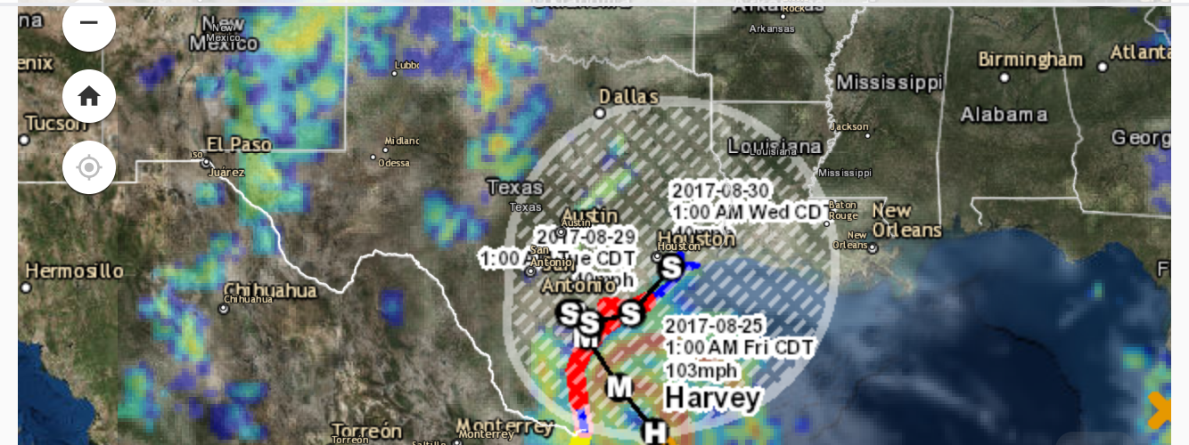 near latitude 26.3 North, longitude 95.8 West. Harvey is moving