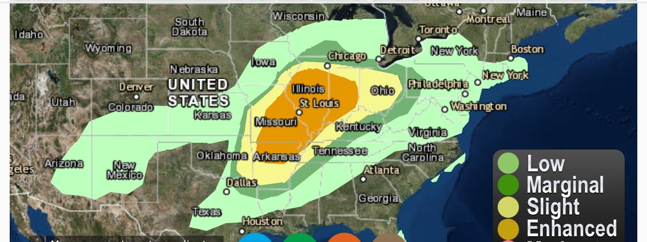 An enhanced severe weather outlook is in effect today for areas from northern Arkansas northeastward across parts of Missouri, Illinois and Indiana. A slight risk of severe weather extends from Texas into the Ohio Valley. The main threat for severe weather will be this afternoon into the late evening hours with the main threats being straight line winds and hail with the possibility of some strong tornadoes. Below is the information directly from the Storm Prediction Center on the current situation. Be sure to check out the features offered on our site to track the severe weather and stay ahead of the storms.
